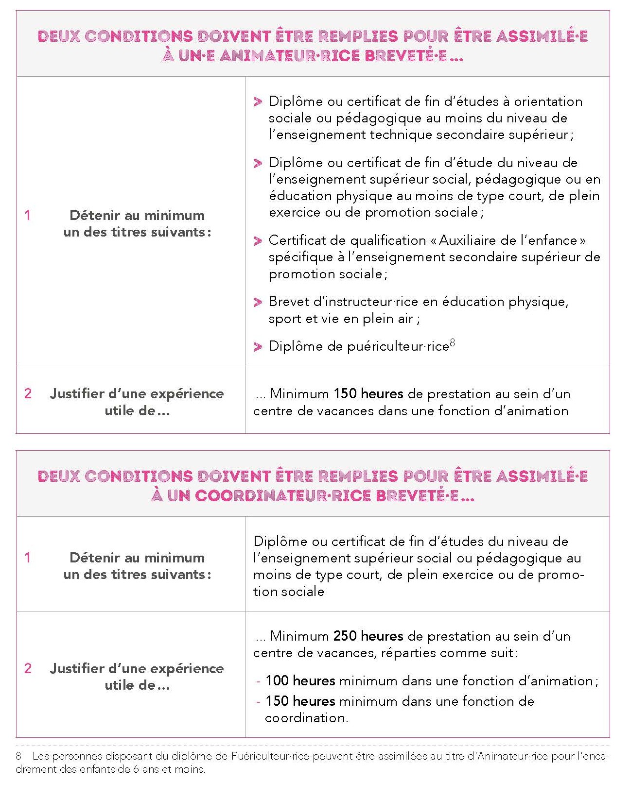 Certains diplômes ou titres peuvent être assimilés au brevet d’animateur·rice ou de coordinateur·rice en centre de vacances, moyennant une certaine expérience sur le terrain. Notez qu’une assimilation ne débouche pas sur l’octroi d’un document officiel de la Fédération Wallonie-Bruxelles. Par contre, les assimilations ouvrent le droit à la subvention d’encadrement et sont donc importantes pour l’agrément du Centre de vacances !